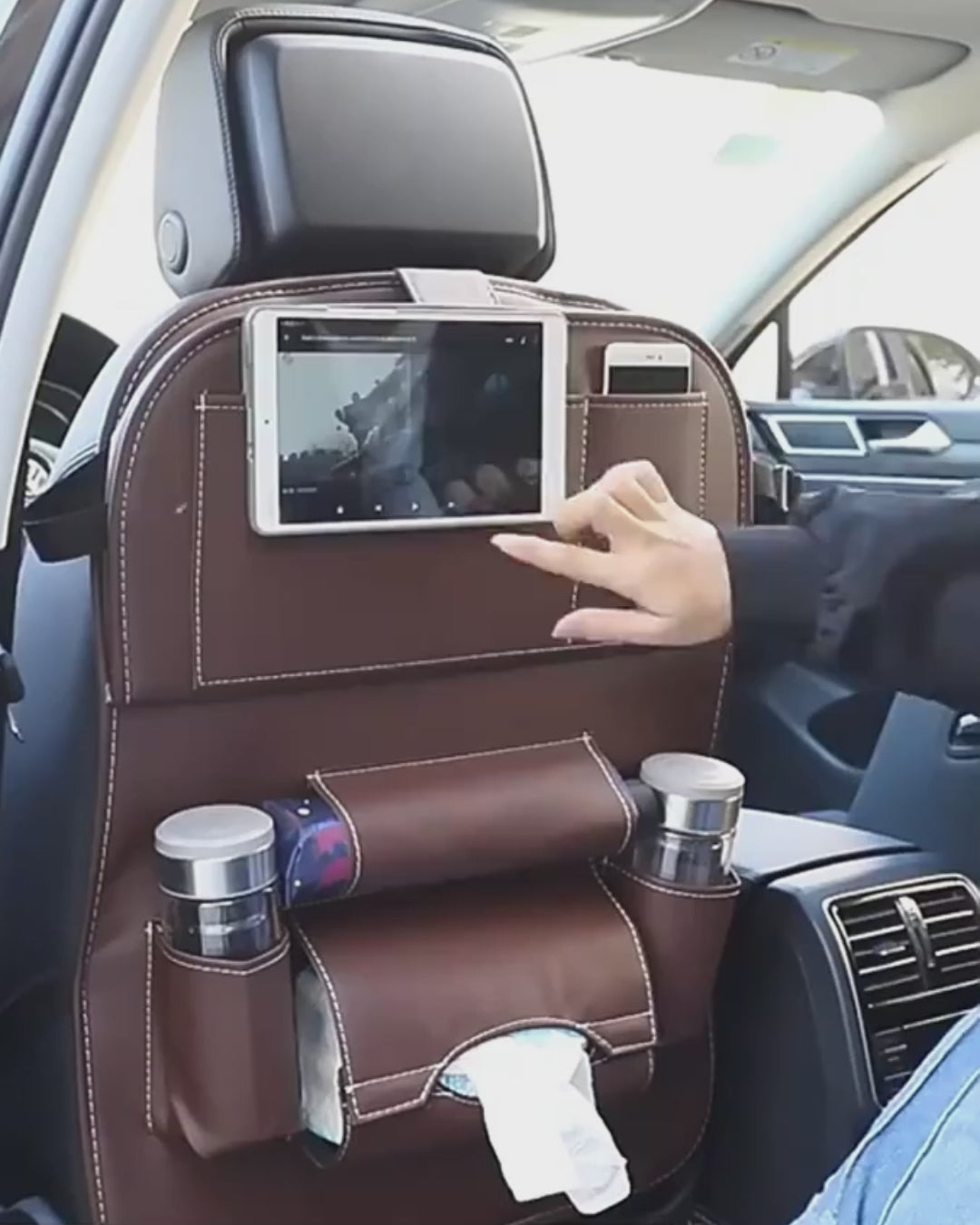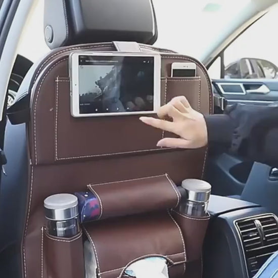 This multifunctional car seat hanging tray turns the back of your front seat into a practical travel station. It uses high-quality PU leather, a synthetic leather designed to resist dirt, scuffs, and constant kicking — ideal for families, ride-shares, or anyone who wants a cleaner, more organized car interior.